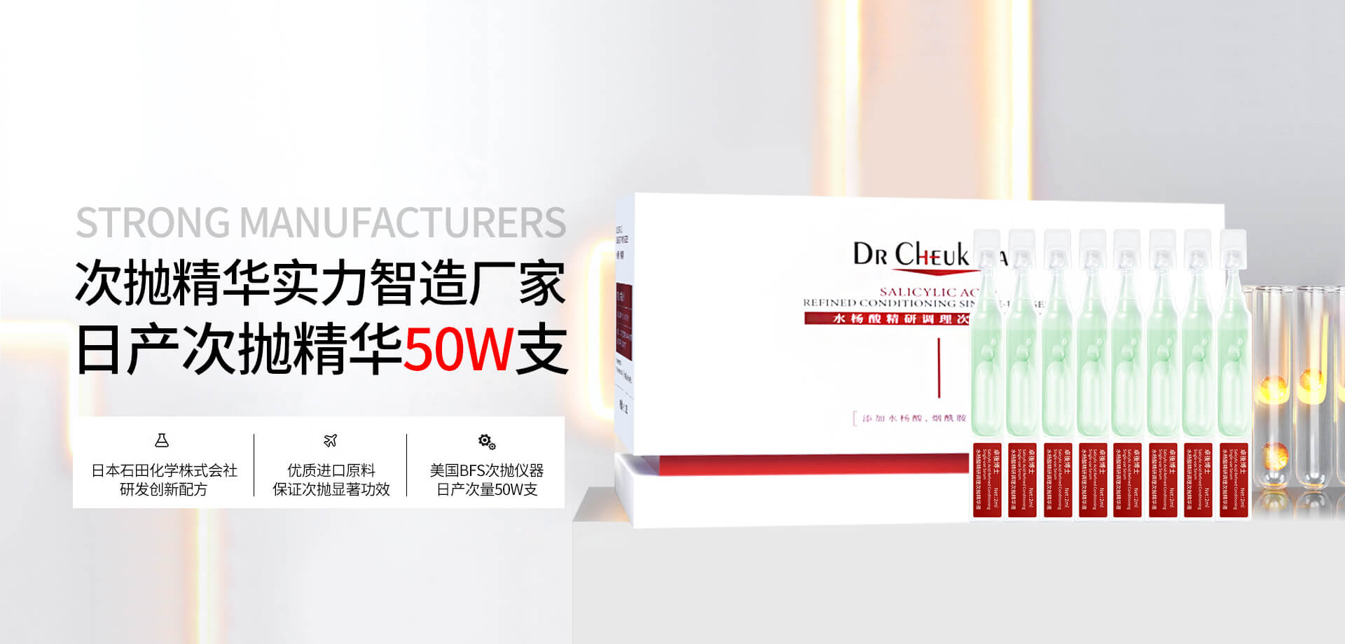 中科利美集團(tuán)生產(chǎn)基地位于廣東肇慶,占地面積達(dá)50000平方米,廠房嚴(yán)格按歐盟GMPC標(biāo)準(zhǔn)設(shè)計(jì),擁有10萬級(jí)無菌生產(chǎn)車間、現(xiàn)代化的研發(fā)中心、高端的生產(chǎn)設(shè)備,自動(dòng)化的生產(chǎn)流水線,先進(jìn)的生產(chǎn)工藝,并以卓越的品質(zhì)通過GMPC、ISO9001、ISO14001、ISO22716等國(guó)際質(zhì)量管理體系認(rèn)證。